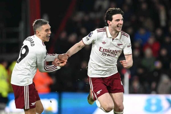 Mikel Arteta heeft Declan Rice geprezen als een van de beste middenvelders ter wereld na zijn dubbele treffer in de tweede helft tijdens Arsenal’s knappe 2-3 zege op bezoek bij Bournemouth. Arsenal moest diep gaan in het Vitality Stadium. Een mislukte pass van Gabriel gaf Evanilson al na tien minuten de uitgelezen kans om Bournemouth…